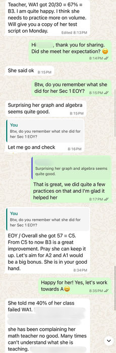 "Appreciate all the guidance Jia Xin has given to Mic. He was able to understand the Math concepts clearly, and he finds her topical worksheets very helpful. He was failing A-Math for WA1 and WA2 before attending Jia Xin's classes, and managed to pass EOY and we were very happy that he got B4 overall."